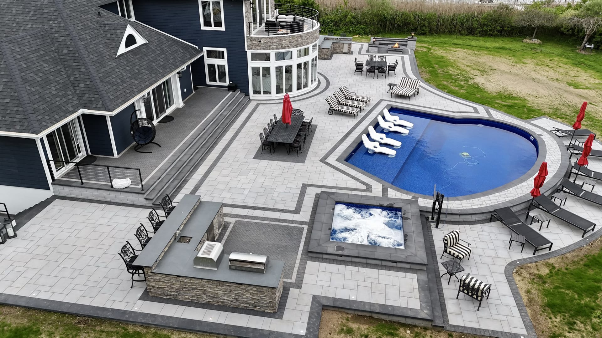 Waterfront estate in Massapequa. From bare construction site to resort-level outdoor living, pool hardscape with fire features, paver patio, outdoor kitchen, and curved asphalt driveway.