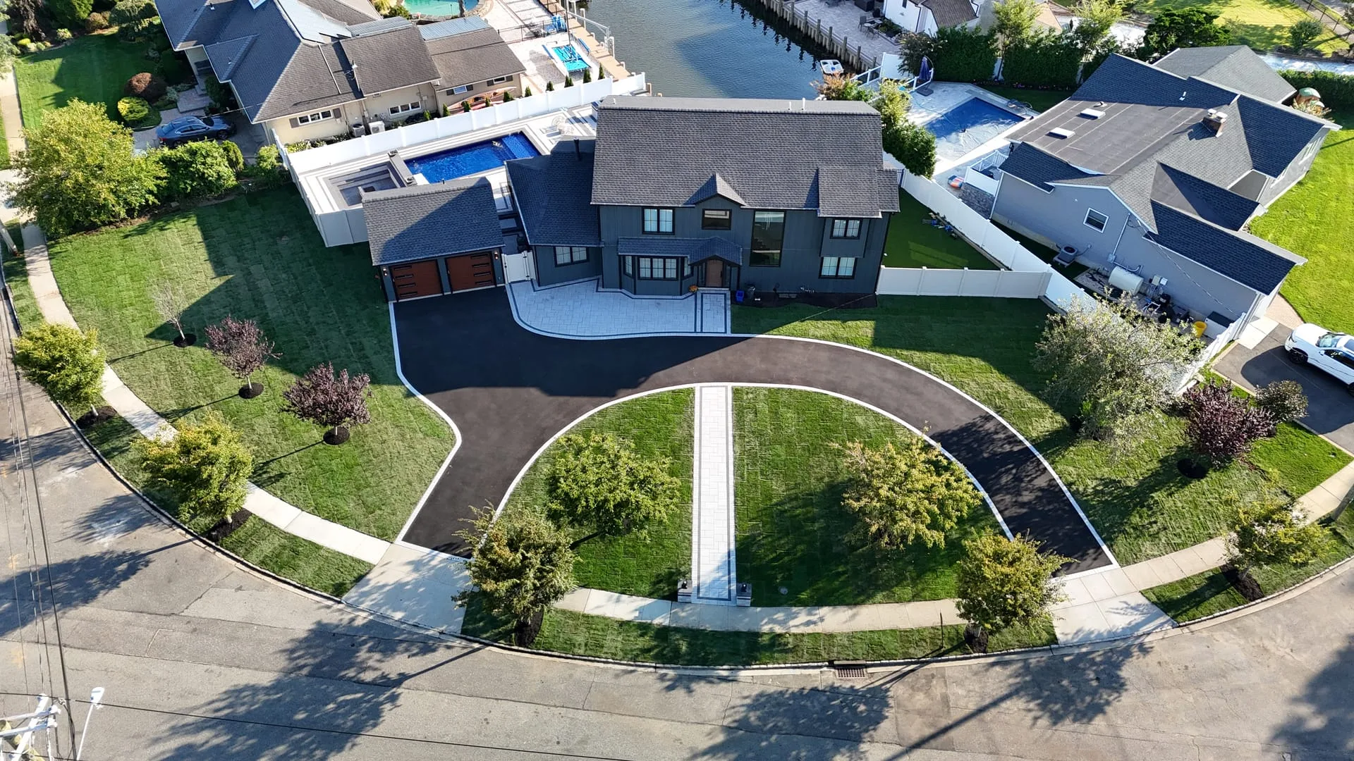 Material selection is a key decision. Interlocking pavers from Cambridge, Nicolock, and Belgard are the most popular choice for Long Island front entries, offering an enormous range of colors, textures, and patterns. Natural stone such as bluestone and granite provides an upscale, timeless look that pairs beautifully with masonry stoops and stone veneer. Concrete with a smooth or broom finish delivers a clean appearance at a more accessible price point. Design features we incorporate include gentle curves, flared landings at driveway transitions, integrated step-ups for grade changes, contrasting border courses, and pillar-flanked entryways. Low-voltage landscape lighting along walkway edges extends visual impact into the evening and adds safety.